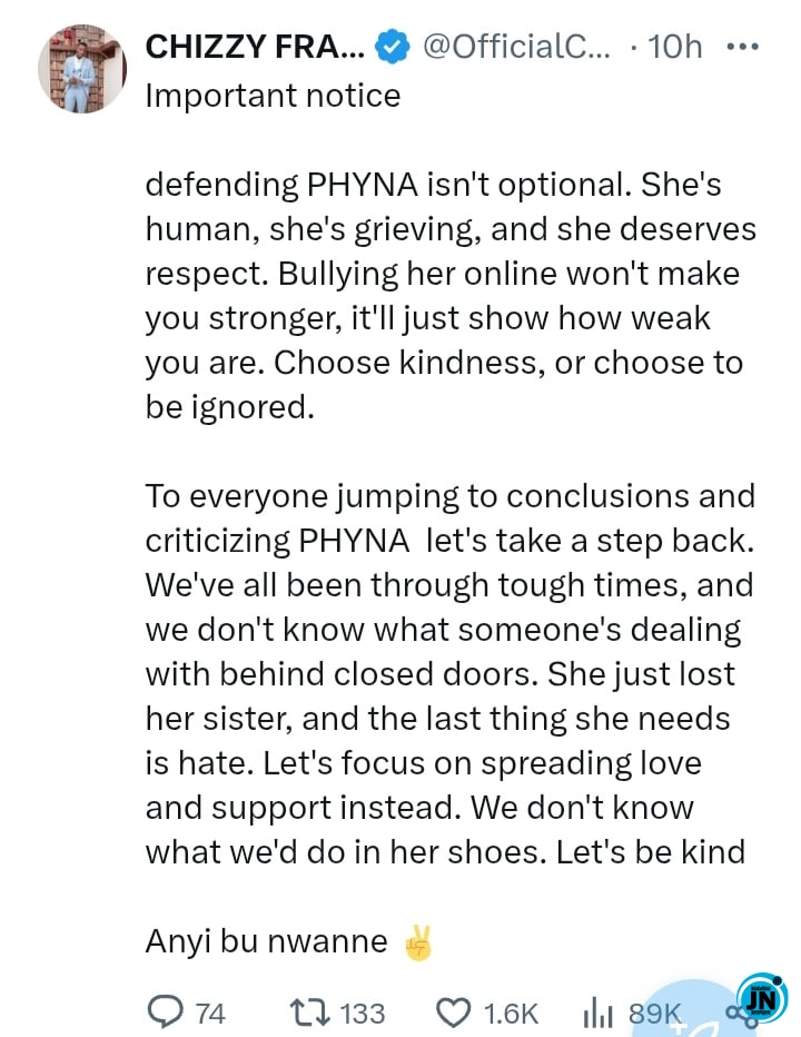 His full statement read: “Important notice: defending PHYNA isn’t optional. She’s human, she’s grieving, and she deserves respect. Bullying her online won’t make you stronger, it’ll just show how weak you are. Choose kindness, or choose to be ignored. To everyone jumping to conclusions and criticizing PHYNA let’s take a step back. We’ve all been through tough times, and we don’t know what someone’s dealing with behind closed doors. She just lost her sister, and the last thing she needs is hate. Let’s focus on spreading love and support instead. We don’t know what we’d do in her shoes. Let’s be kind. Anyi bu nwanne ✌️”
