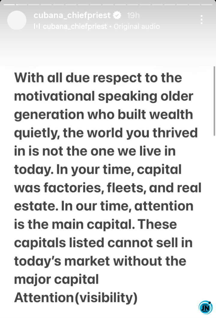 In a detailed and lengthy Instagram post, Chief Priest offered a compelling perspective on generational differences in wealth creation, arguing that while older entrepreneurs like Maduka built their fortunes through factories, fleets, and real estate, today’s generation of business leaders thrives on attention, visibility, and influence, which he described as the “new currency” in a digital-driven economy.
