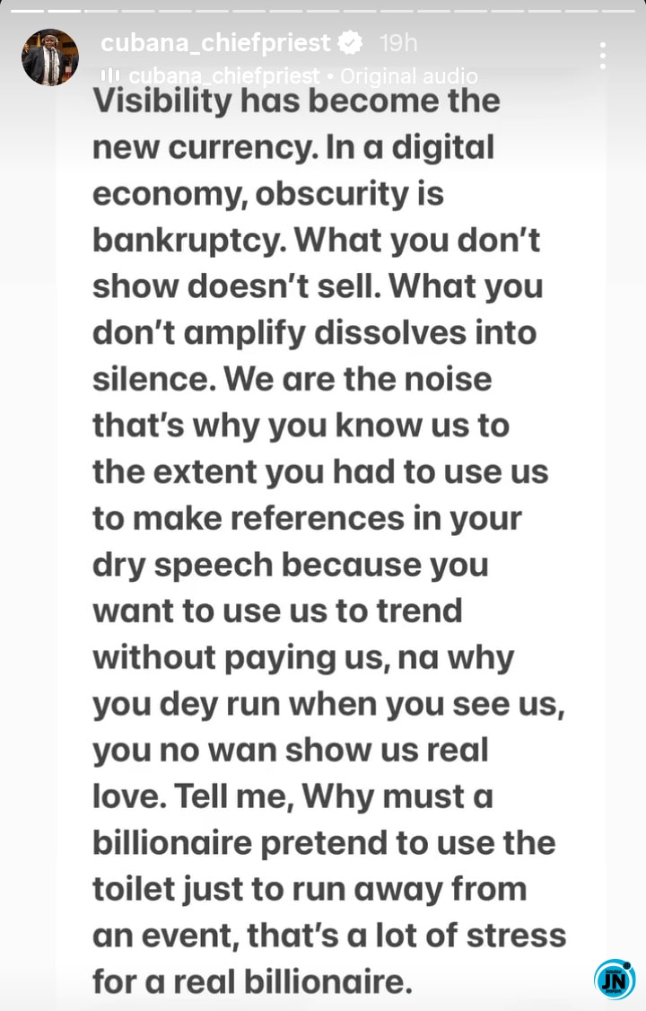 He elaborated: “Visibility has become the new currency. In a digital economy, obscurity is bankruptcy. What you don’t show doesn’t sell. What you don’t amplify dissolves into silence. We are the noise that’s why you know us to the extent you had to use us to make references in your dry speech because you want to use us to trend without paying us, na why you dey run when you see us, you no wan show us real love. Tell me, Why musta billionaire pretend to use the toilet just to run away from an event, that’s a lot of stress for a real billionaire.”