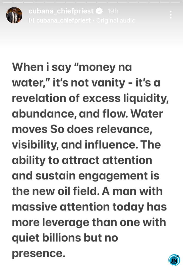 Chief Priest also clarified that his criticisms were not personal attacks but part of his vision for redefining success, influence, and wealth in Africa’s evolving social and digital landscape. He reiterated that the phrase “Money na water” is a declaration of prosperity, abundance, and the flow of resources, and remains central to his brand identity and upcoming music projects. He encouraged his followers to embrace visibility, engagement, and active participation in creating value in the modern economy.