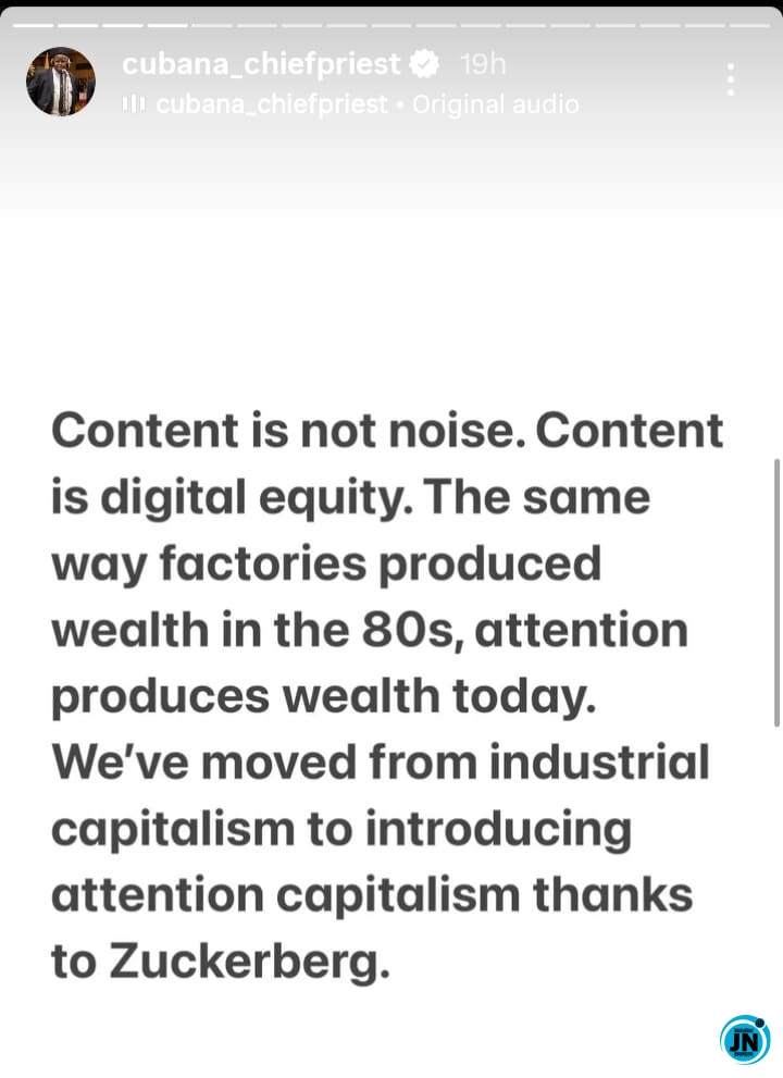 He stressed the philosophy behind “Money na water,” explaining that the phrase represents abundance, liquidity, and the movement of influence in modern society. “Water moves. So does relevance, visibility, and influence. The ability to attract attention and sustain engagement is the new oil field. A man with massive attention today has more leverage than one with quiet billions but no presence,” he added. Chief Priest positioned content as a modern form of digital equity, akin to the industrial capital that produced wealth in prior decades, signaling a shift from industrial capitalism to what he termed “attention capitalism,” crediting platforms like Facebook for pioneering this transformation.