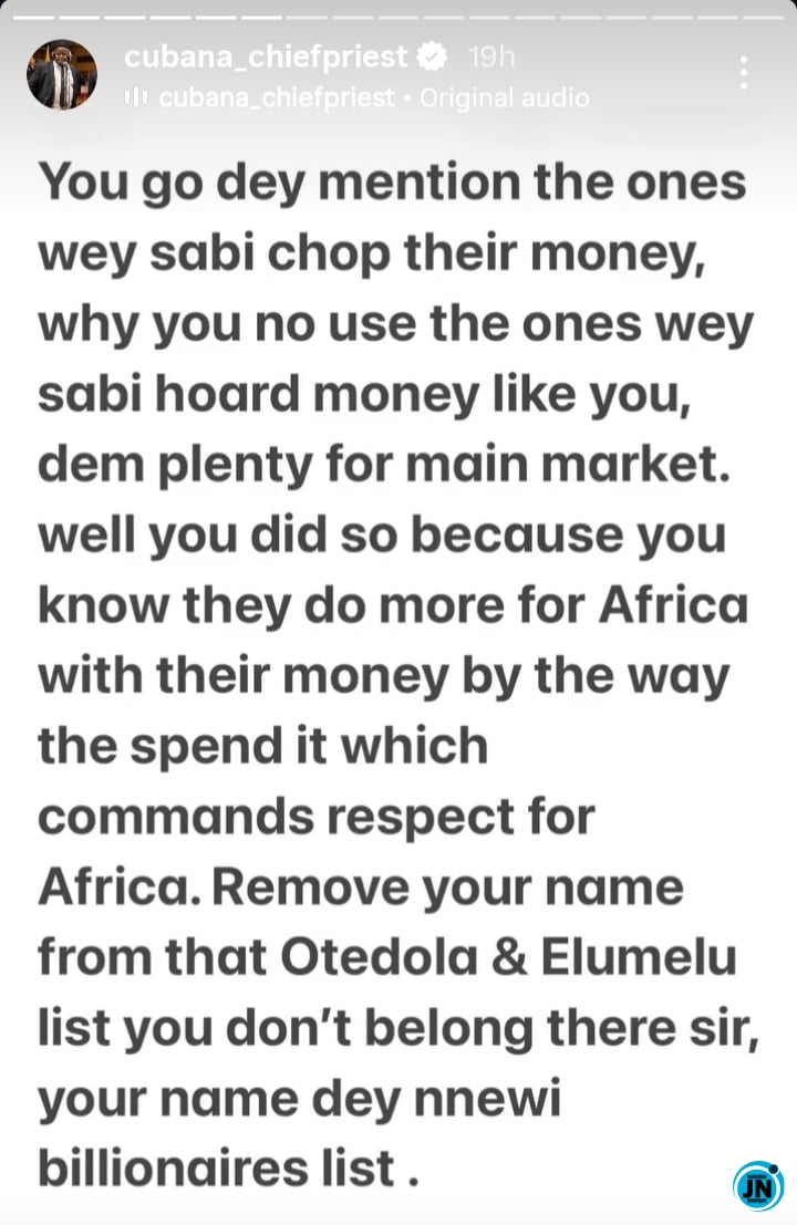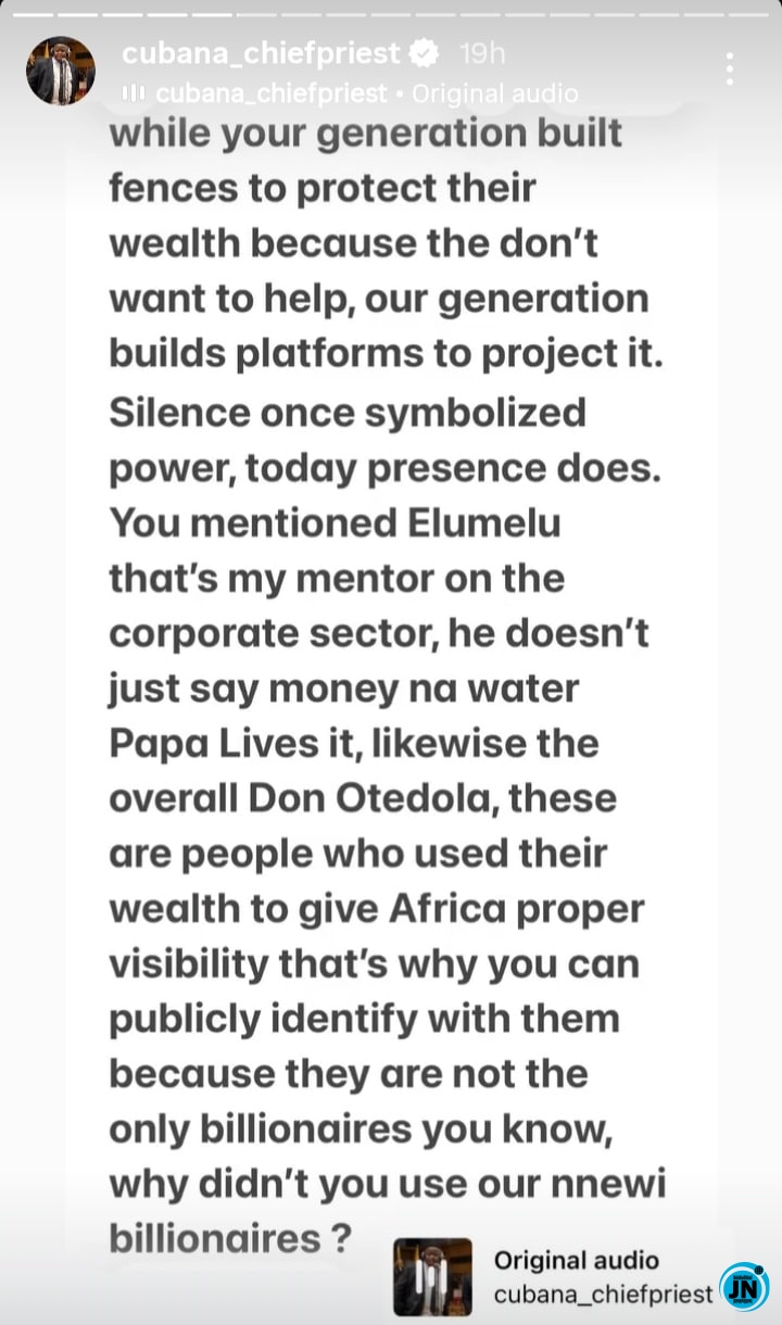 Chief Priest also took aim at Maduka for publicly mentioning certain African billionaires like Tony Elumelu and Femi Otedola as examples of wealth usage, suggesting that Maduka did not align with the same values. He praised Elumelu and Otedola for using their resources to uplift Africa and give visibility to local entrepreneurs, contrasting this with those who hoard wealth quietly. Chief Priest urged that the focus should be on how wealth is deployed to create impact, stating that his generation builds platforms for projection while older generations built fences to protect wealth.