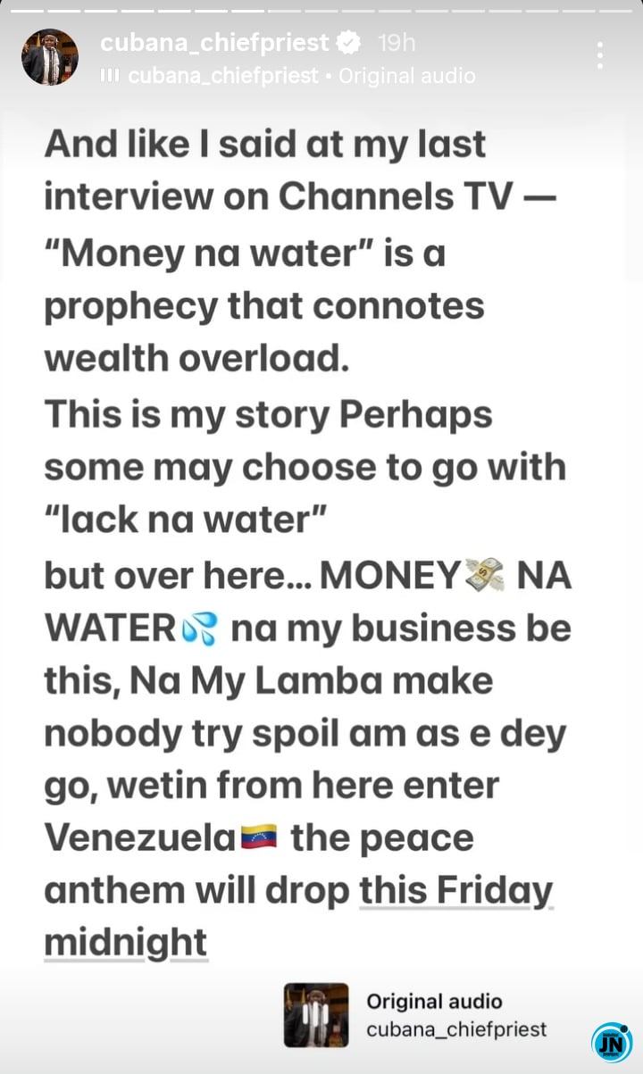 He concluded with a message reinforcing his upcoming music release: “Money na water is a prophecy that connotes wealth overload. This is my story. Perhaps some may choose to go with ‘lack na water,’ but over here… MONEYS NA WATER? Na my business be this, Na My Lamba make nobody try spoil am as e dey go, wetin from here enter Venezuelas the peace anthem will drop this Friday midnight.”