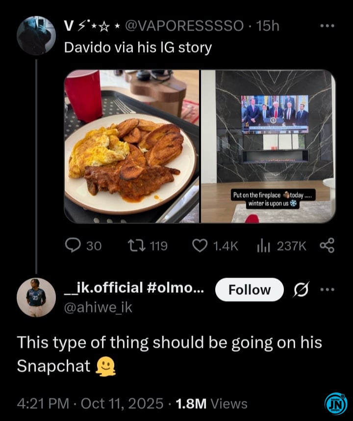 A user identified as @ahiwe_ik left a comment implying that such a simple meal was not befitting for a celebrity of Davido’s status. The user wrote, “This type of thing should be going on his Snapchat,” seemingly mocking the singer for showing off an ordinary plate of food.