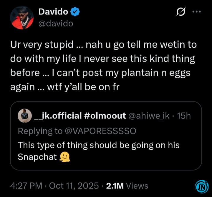 In his words: “Ur very stupid… nah u go tell me wetin to do with my life? I never see this kind thing before… I can’t post my plantain n eggs again… wtf y’all be on fr.”