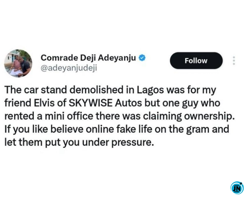 “The car stand that was demolished in Lagos was for my friend, Elvis of SKYWISE Autos, but one guy who rented a mini office there was claiming ownership,” Deji Adeyanju wrote in his post, seemingly addressing the viral confusion that had spread across social media platforms.