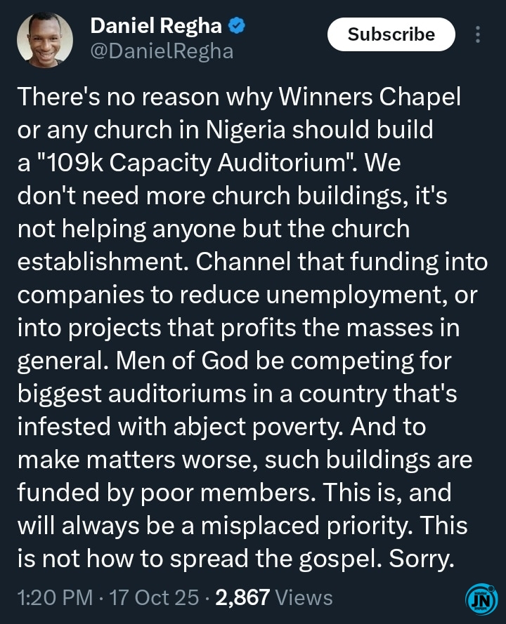 In his detailed post, Regha questioned the motive behind constructing such enormous buildings, describing it as a “misplaced priority” that reflects the growing commercialization of religion in Nigeria.
