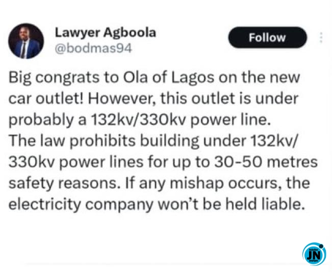 Social media platforms have been thrown into a frenzy after an old tweet from a Nigerian lawyer resurfaced online, revealing that he had long ago warned popular car dealer, Ola of Lagos, about the potential dangers and legal implications of building his luxury car outlet beneath a high-tension power line. The revelation has sparked widespread discussion and debate among Nigerians online.