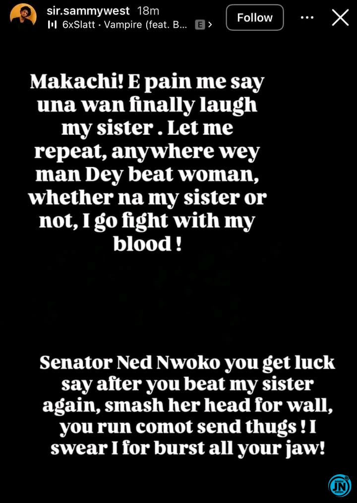Adding fuel to the controversy, Regina Daniels’ brother, identified as Sammy West, took to social media to express his outrage and pain over the alleged assault. In a post shared via his Instagram handle, @sirsammywest, he accused Ned Nwoko of physically assaulting his sister and even claimed that the businessman sent thugs to threaten their family after the incident.