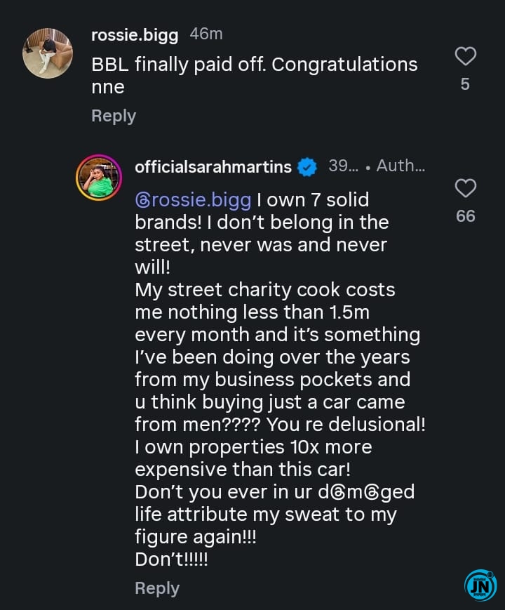 “I own 7 solid brands! I don’t belong in the street, never was and never will. My street charity costs me nothing less than 1.5 million every month, and it’s something I’ve been doing over the years from my business pockets, and you think buying just a car came from men? You’re delusional! I own properties that are 10 times more expensive than this car! Don’t you ever in your damaged life attribute my sweat to my figure again! Don’t.”