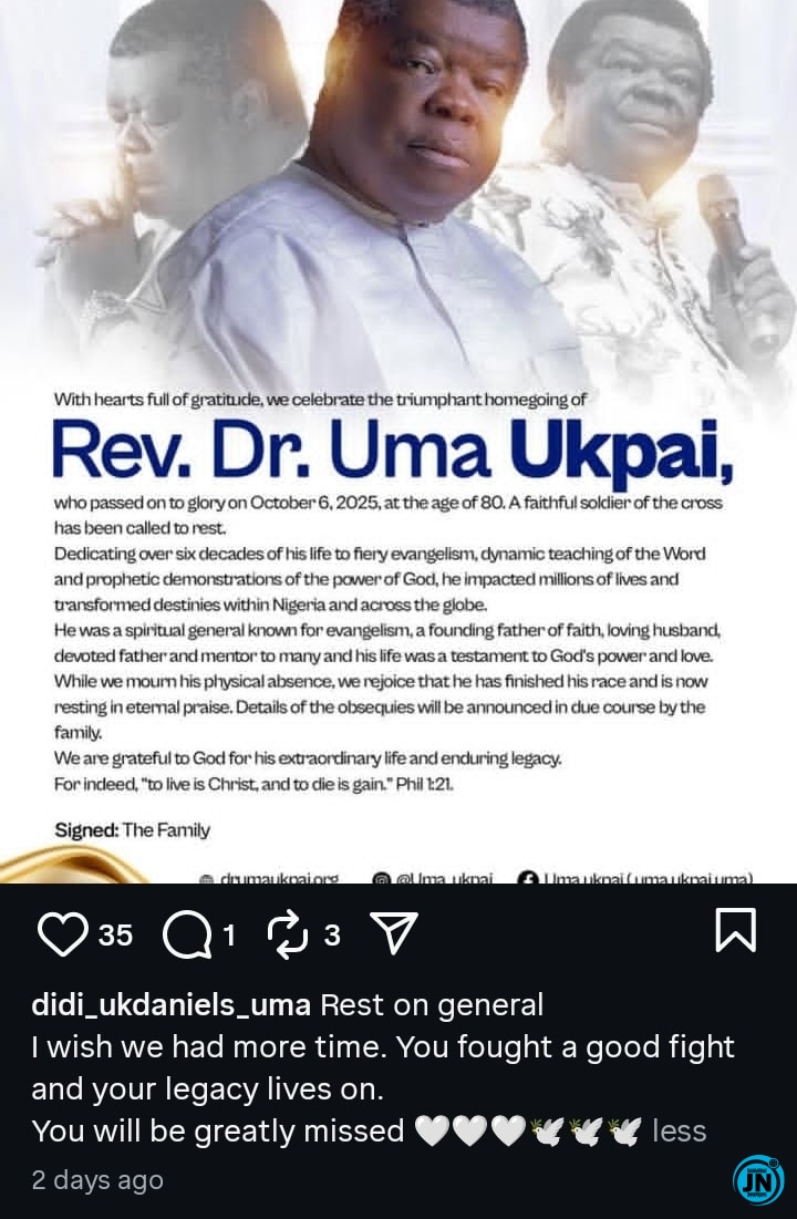 It would be recalled that the news of Uma Ukpai’s passing was officially confirmed through a statement released on his verified Instagram page on October 6, 2025. The announcement sent shockwaves through the Christian community both in Nigeria and abroad, as tributes poured in from spiritual leaders, public figures, and countless admirers whose lives had been touched by his ministry.