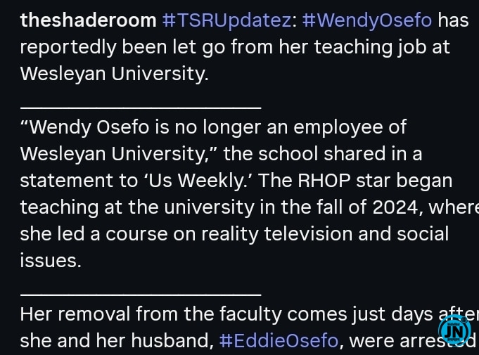 Nigerian-American political commentator and television personality, Wendy Osefo, has reportedly been removed from her position as a professor at Wesleyan University, following serious allegations of fraud involving her and her husband, Eddie Osefo.