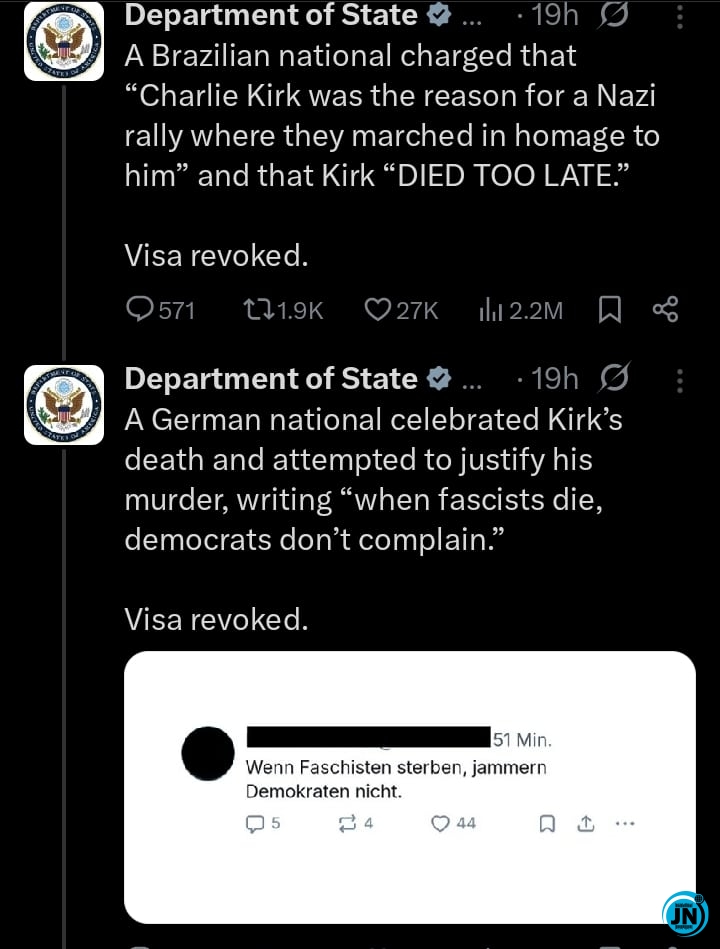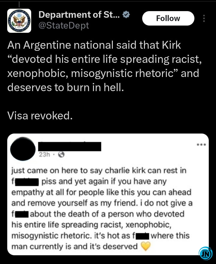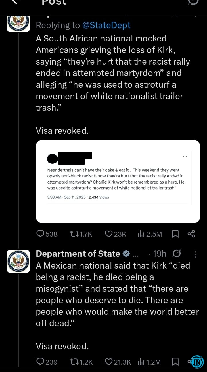 In an official statement posted on the social media platform X (formerly Twitter), the US State Department condemned the “disrespectful and disturbing” actions of individuals who openly mocked or celebrated the killing online. The department confirmed that visa privileges were revoked for six foreigners involved in the act, identifying them as citizens of Argentina, South Africa, Mexico, Brazil, Germany, and Paraguay.