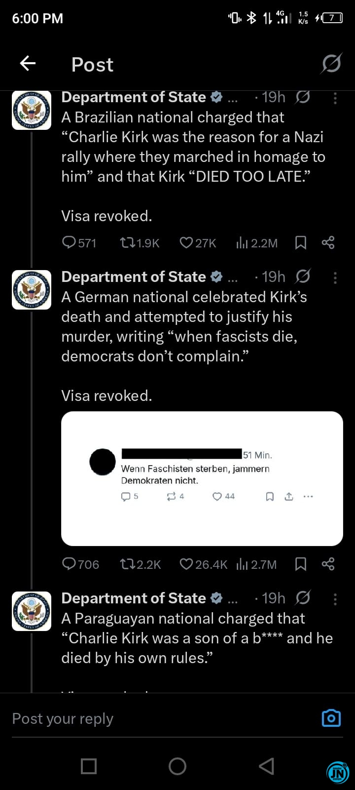 “We take threats and expressions that glorify violence against American citizens very seriously,” the statement read. “Anyone who publicly endorses or celebrates acts of terrorism or assassination has no place within the United States or under its visa protection.”