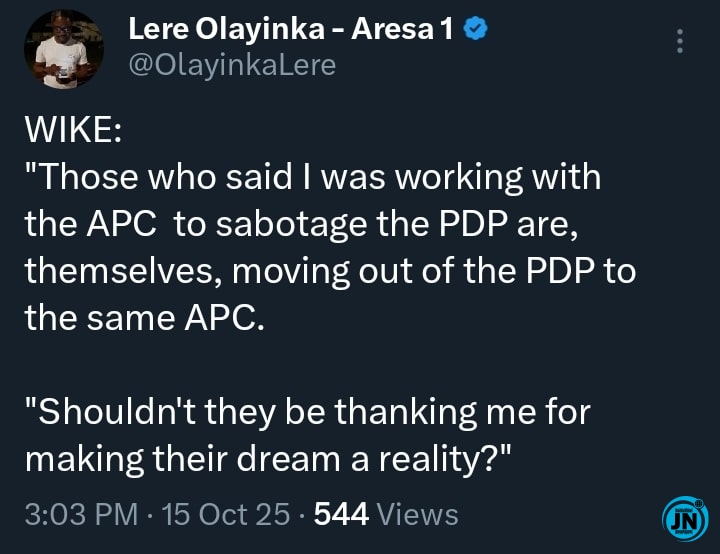 Reacting to the dramatic political shift, Nyesom Wike, through his media aide Lere Olayinka, took to X (formerly Twitter) to respond to the news and make his position clear. Wike’s post carried a tone of sarcasm and political commentary aimed at those who had previously accused him of conspiring with the APC to sabotage the PDP. He wrote:
