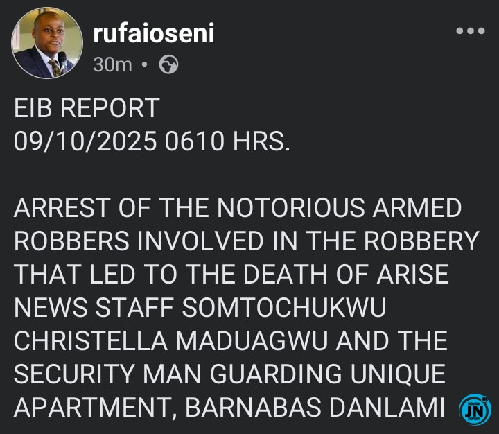 Arise Television journalist, Rufai Oseni, has provided a detailed update on the tragic death of his late colleague, Somtochukwu Christella Maduagwu, who was fatally attacked during a robbery at her Abuja residence, an incident that also claimed the life of the apartment’s security guard, Mr. Barnabas Danlami. Oseni shared the information on his social media page on Thursday, highlighting the latest progress in the ongoing investigation into the incident, which has drawn significant public attention and concern.
