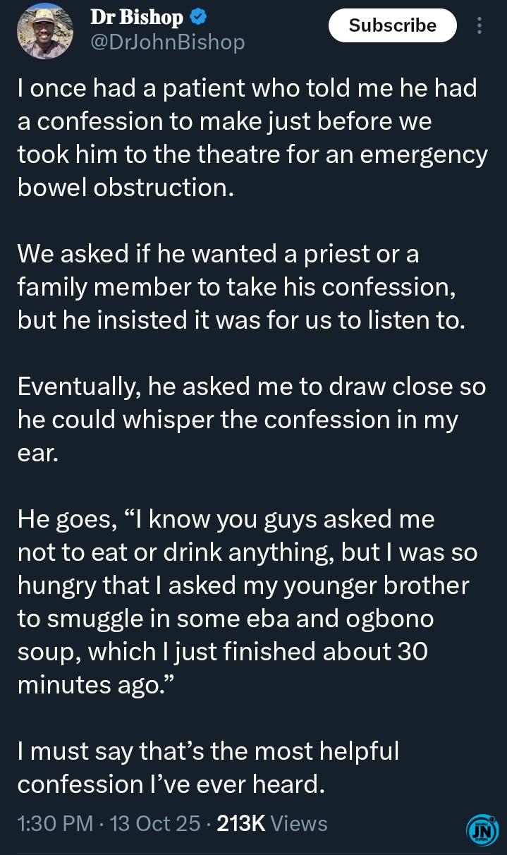 A Nigerian medical doctor, identified as Dr Bishop, has caused widespread laughter online after recounting a hilarious confession made by one of his patients just moments before undergoing surgery.