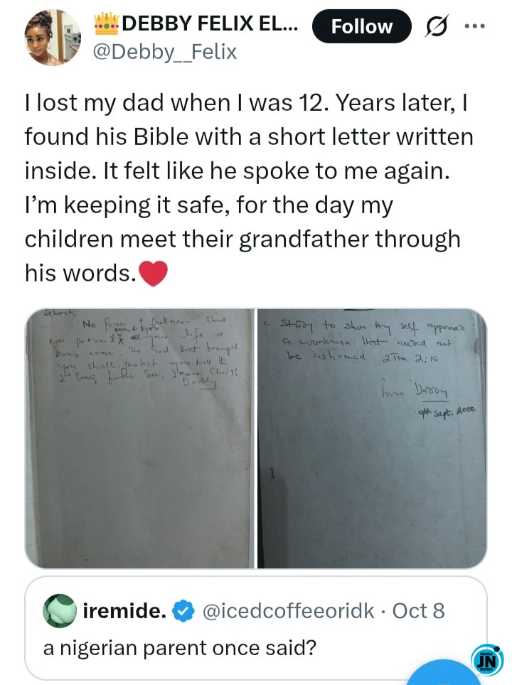 A young lady, identified as Deborah, has stirred emotions online after sharing a deeply touching discovery she made while going through her late father’s belongings. The emotional revelation came years after she lost her dad at the tender age of 12.