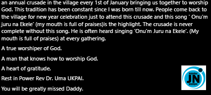 She shared: “He is often heard singing ‘Onu’m juru na ekele’ (My mouth is full of praises) at every gathering. A true worshipper of God. A man that knows how to worship God. A heart of gratitude. Rest in Power, Rev. Dr. Uma Ukpai. You will be greatly missed, Daddy.”