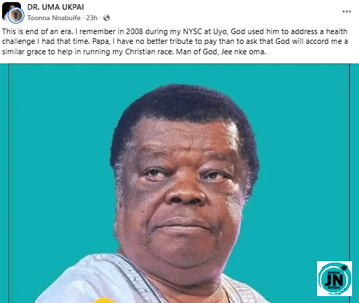 The post quickly garnered attention online, drawing responses from thousands of social media users who shared their own reflections, memories, and personal encounters with the late evangelist. Many users expressed condolences and celebrated Uma Ukpai’s contributions to spiritual life, while others shared inspiring stories of how his teachings and interventions had positively impacted their own lives. The comments section became a space of collective mourning, remembrance, and tribute to a man whose influence touched countless lives across generations.