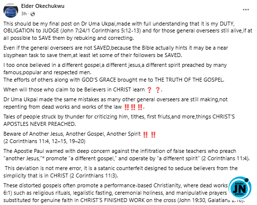He wrote, “This should be my final post on Dr Uma Ukpai, made with full understanding that it is my DUTY, OBLIGATION to JUDGE (John 7:24/1 Corinthians 5:12-13) and for those general overseers still alive, if at all possible to SAVE them by rebuking and correcting. Even if the general overseers are not SAVED, because the Bible actually hints it may be a near Sisyphean task to save them, at least let some of their followers be SAVED. I too once believed in a different gospel, a different Jesus, a different spirit preached by many famous, popular and respected men. The efforts of others along with GOD’S GRACE brought me to THE TRUTH OF THE GOSPEL. When will those who claim to be Believers in CHRIST learn? Dr Uma Ukpai made the same mistakes as many other general overseers are still making, not repenting from dead works and works of the law…”