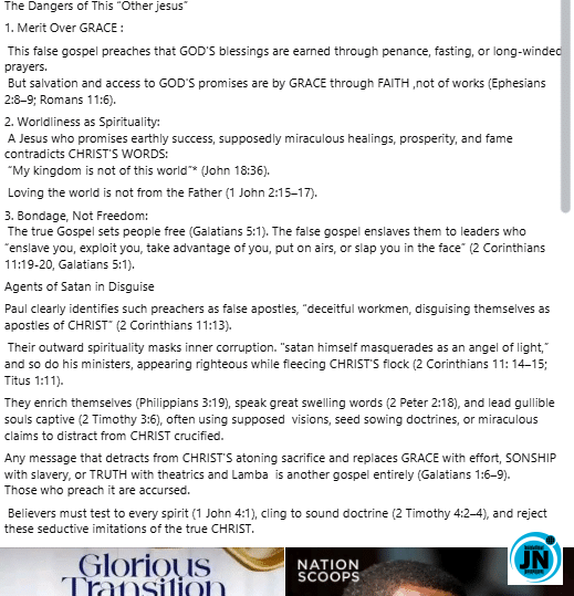 His post has generated significant attention, with many followers discussing the importance of testing every spiritual teaching and ensuring that doctrines align with the core message of Christianity. The revelations have ignited conversations about accountability, discernment, and spiritual leadership within Nigerian churches.