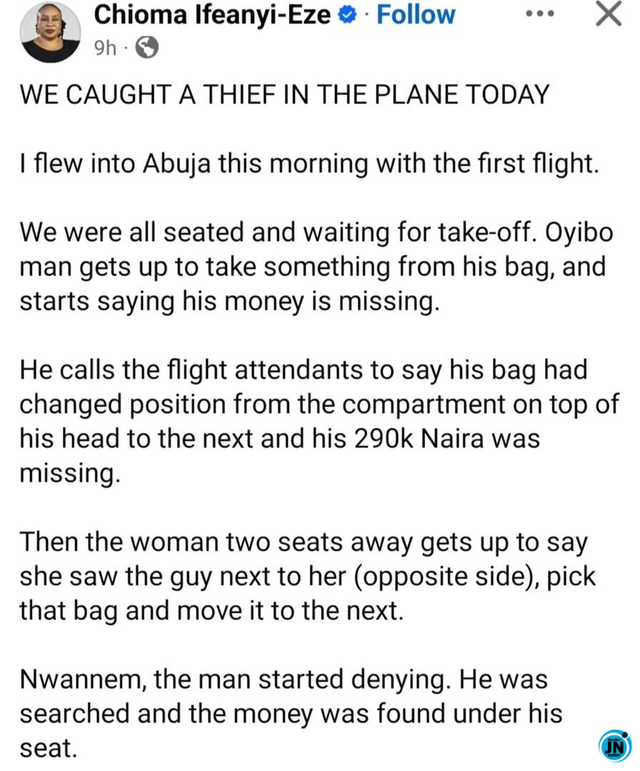 A Nigerian businesswoman has shared a detailed and shocking account of an in-flight incident that left many passengers stunned after a man was allegedly caught red-handed stealing ₦290,000 from a foreign passenger on an Abuja-bound flight.